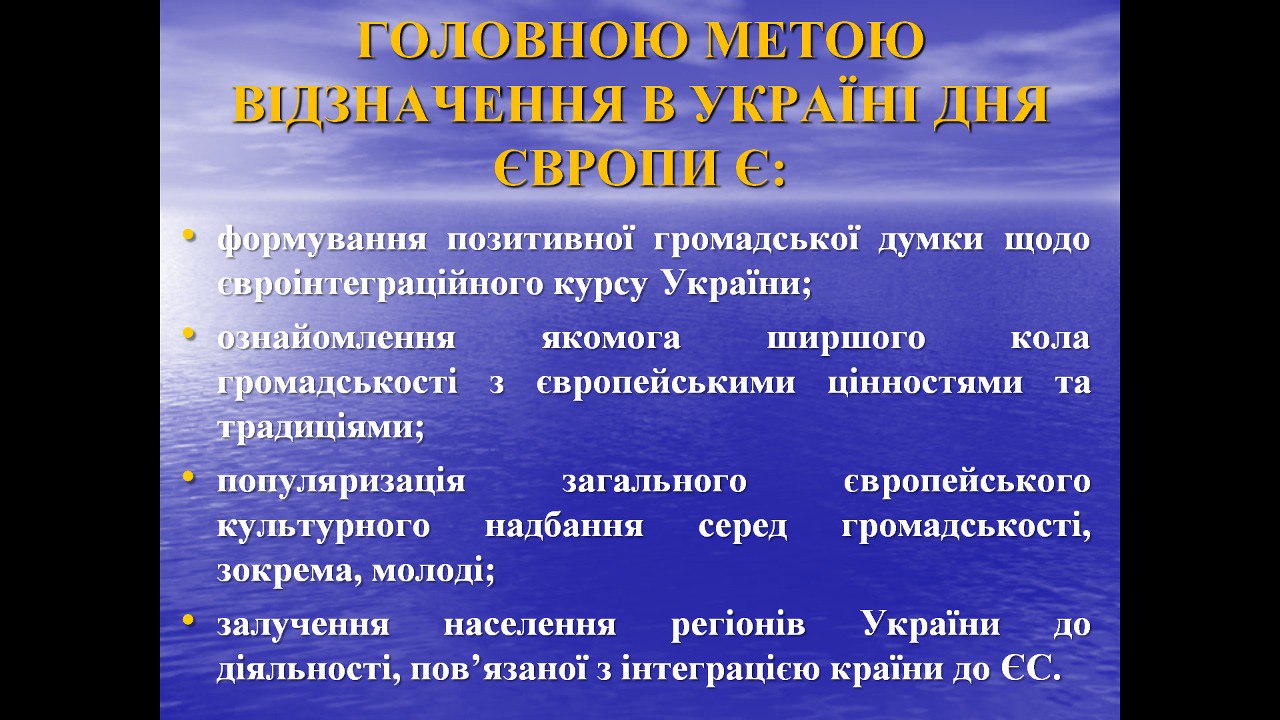 Основною метою проведення такого заходу є формування позитивної громадської думки щодо євроінтеграційного курсу України; поглиблення знань громадян про країни Європи, підкреслення приналежності нашої держави до європейської сім’ї народів і безперечність її європейського вибору в майбутньому.