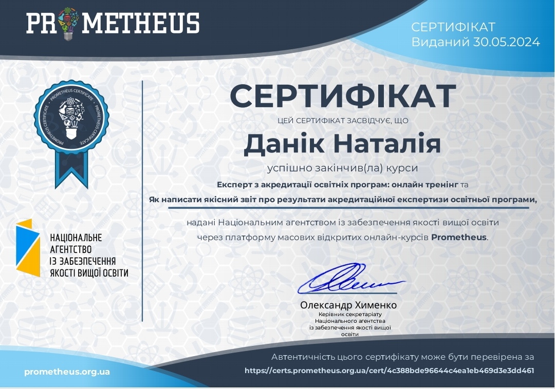 Завідувачка кафедри економіки, менеджменту та фінансів, доцент Наталія Вадимівна Данік успішно склала тест для кандидатів у експерти Національного агентства із забезпечення якості вищої освіти. Щиро вітаємо Наталію Вадимівну з цим значним досягненням! Її успіх підтверджує високий професійний рівень та компетентність, а також сприяє підвищенню авторитету нашої кафедри.