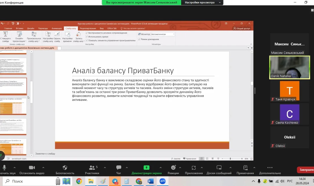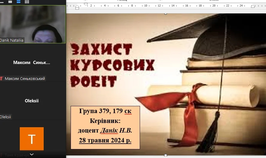 28 травня 2024 року на базі кафедри економіки, менеджменту та фінансів Миколаївського національного університету імені В.О. Сухомлинського відбувся онлайн захист курсових робіт з дисципліни “Банківська система”. Студенти 3 курсу представили свої дослідження, виконані під керівництвом доцента Данік Наталії Вадимівни.