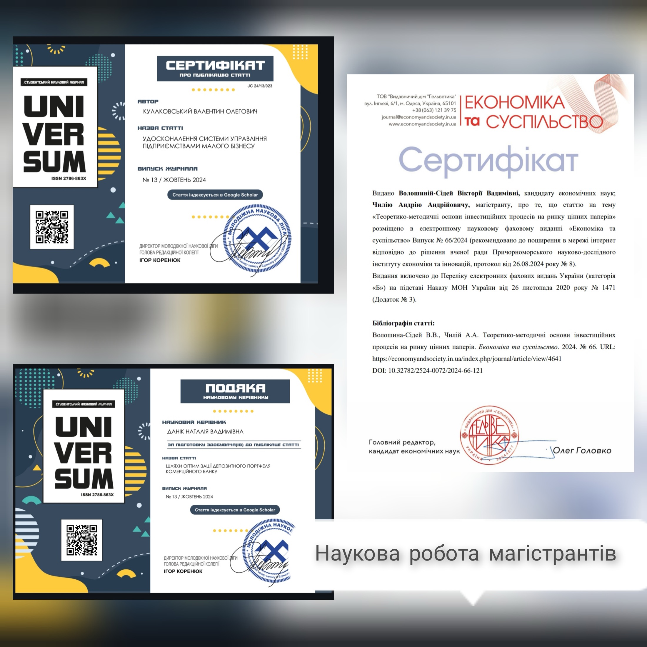 Викладачі кафедри економіки менеджменту та фінансів працюють над залученням здобувачів освіти до активної науково-дослідної роботи. Метою є розвиток студентів і використання їх творчого потенціалу для вирішення проблем підвищення ефективності діяльності організацій і підприємств, виховання активних, всебічно розвинених фахівців.