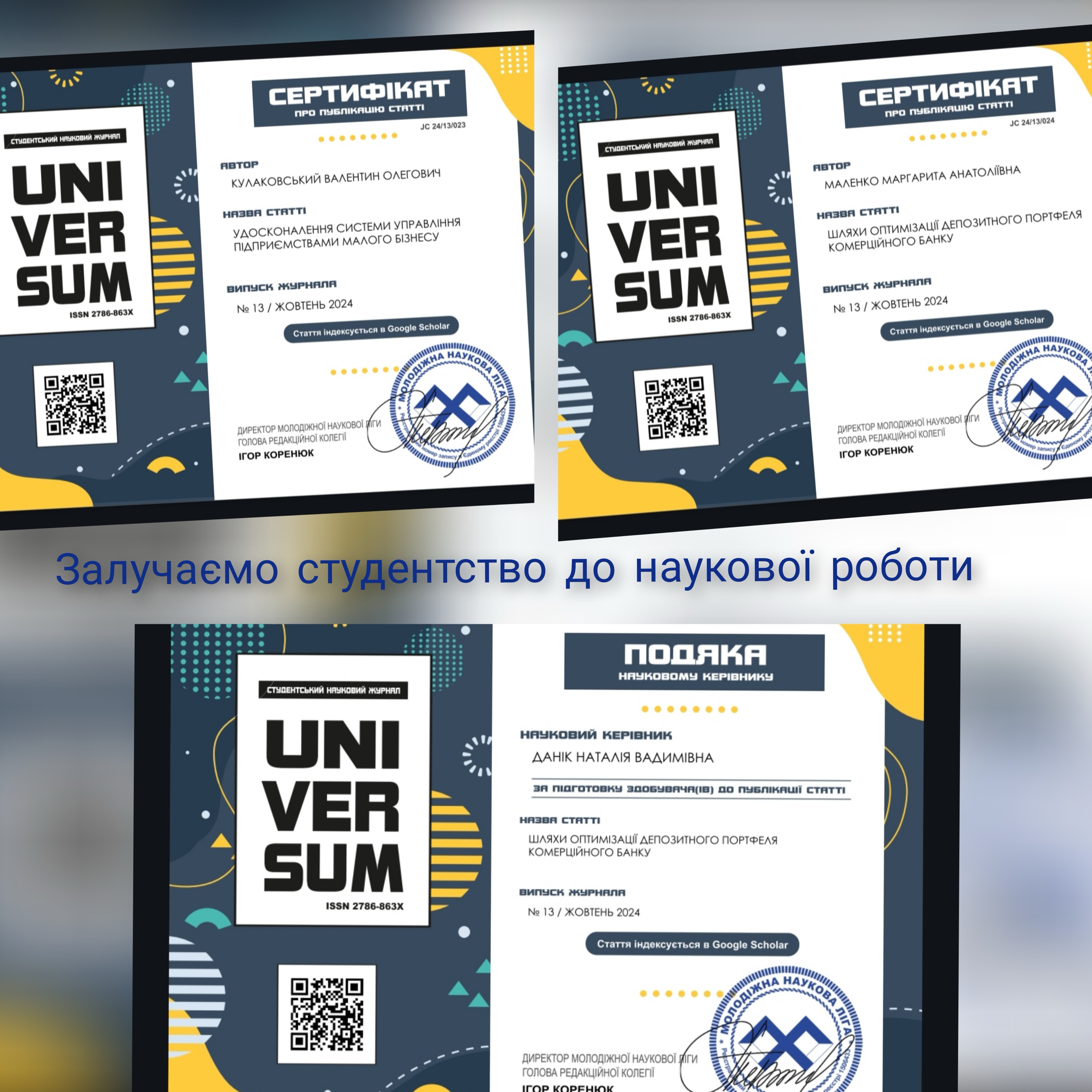 Наші студенти долучаються до роботи кафедри за науково-дослідною темою, результатом чого є публікації у наукових журналах, участь з виступами на всеукраїнських та міжнародних науково-практичних конференціях.
