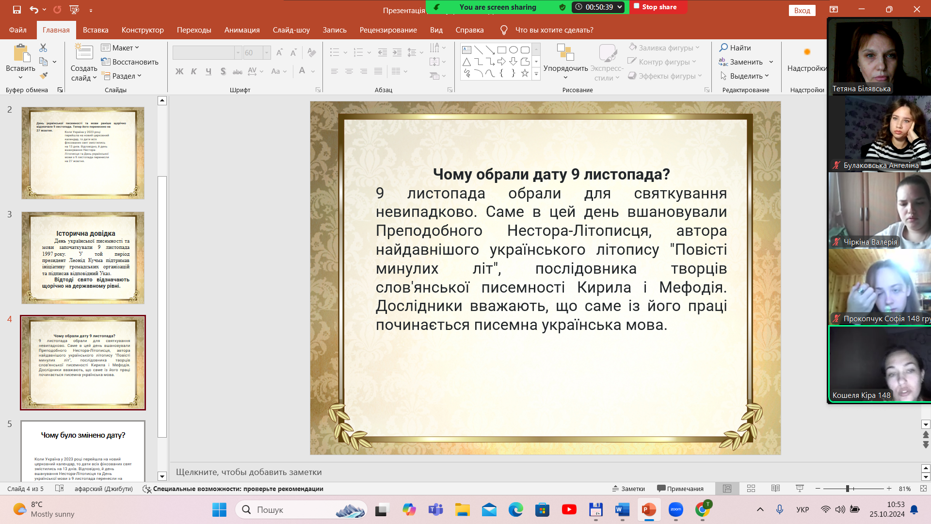 Вже другий рік поспіль Україна відзначає День української писемності та мови за новою датою – 27 жовтня. Долучилися до святкування й студенти спеціальності 013 Початкова освіта. Так, 25 жовтня 2024 року було проведено круглий стіл, у межах якого висвітлено причини зміни нової дати (керівник заходу – Білявська Т. М.). Зокрема, наголошено, що це пов’язано з переходом Православної церкви України на новоюліанський календар, за яким дати неперехідних свят перенесено на 13 днів раніше. Тож день пам’яті Нестора Літописця припадає на 27 жовтня.