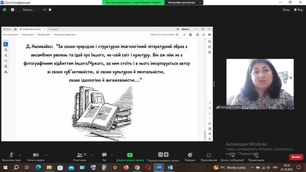 23 жовтня «гостьову» лекцію студентам і магістрантам спеціальності «Українська мова і література» філологічного факультету Миколаївського національного університету імені В. О. Сухомлинського прочитала кандидатка філологічних наук, доцентка, завідувачка кафедри української літератури Запорізького національного університету Наталія Горбач. Тонко і гостро відчуваючи проблематику сучасного українського літературного процесу, шановна Наталія Вікторівна оригінально висвітлила вкрай недостатньо досліджену вітчизняними науковцями тему – «Література як культурне картографування: імагологічна візуалізація України», паралельно окресливши основні вектори розвитку вивчення цього напрямку. Синтез обсяжного художнього корпусу зарубіжних творів (передусім німецьких, французьких і норвезьких) із варіативно тематичною рецепцією історичних періодів розвитку України, а також струнка логіка переходів по клавіатурі національної пам’яті, незвичайний ракурс піднесення складних тем сприяли високому інтересу авдиторії до матеріалу лекції.