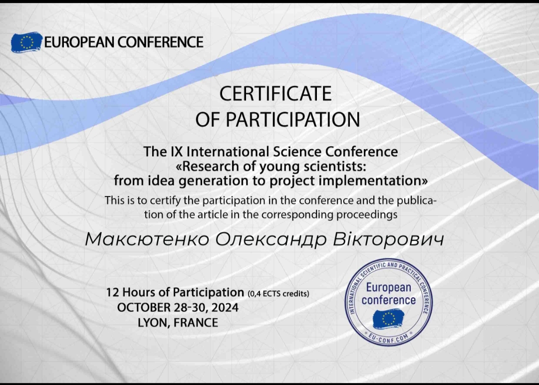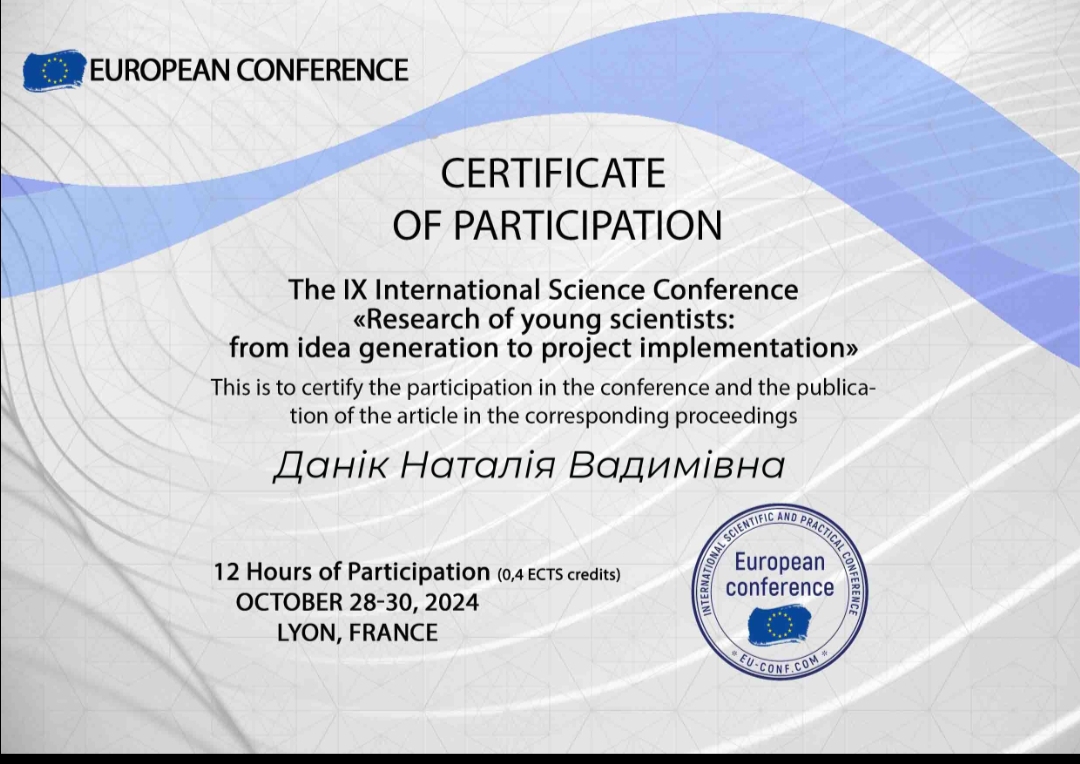 Наукова робота аспірантів кафедри економіки, менеджменту та фінансів. 28-30 жовтня 2024 р. аспіранти другого курсу навчання спеціальності 051 «Економіка»: Торлопов Артемій, Федоров Віталій та Максютенко Олександр під керівництвом завідувача кафедри економіки, менеджменту та фінансів, доцента Данік Наталії Вадимівни успішно представили результати своїх досліджень на Міжнародній науково-практичній конференції «Research of young scientists: from idea generation to project implementation» у м. Ліон (Франція). У межах заходу молоді науковці мали змогу провести апробацію своїх наукових розробок, що стало важливим кроком у процесі здійснення їхніх досліджень. На конференції аспіранти не лише презентували свої напрацювання, але й отримали цінні відгуки від міжнародних колег, що допоможе їм вдосконалити свої роботи. Вони також обмінялися досвідом з іншими науковцями, ознайомилися з останніми тенденціями у своїй галузі, розширили коло професійних контактів. Участь у конференції стала важливим етапом для аспірантів, сприяючи зростанню їхнього професійного досвіду та підготовки до подальшої наукової діяльності.