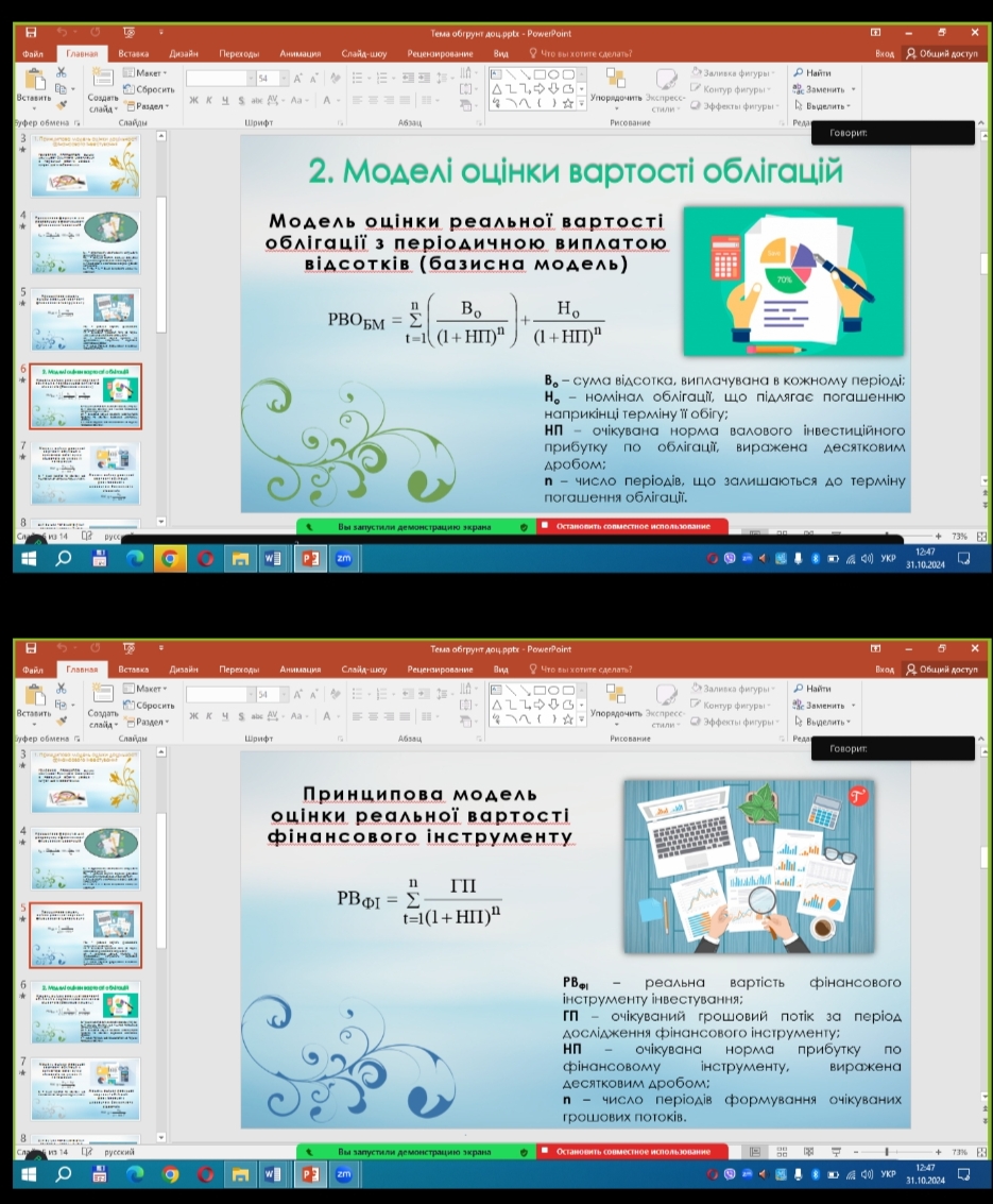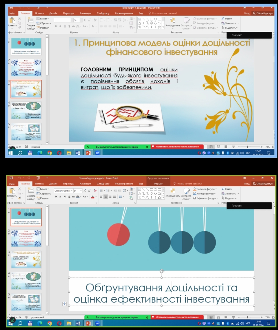 31.10.2024 к.е.н., доцентом Рудь І. Ю. проведено відкрите заняття-лекцію з дисципліни «Інвестування» (тема: Обґрунтування доцільності та оцінка ефективності інвестування). Викладач ознайомив присутніх з показниками та методами оцінки інвестиційних проектів. Розглянуто традиційні показники оцінки економічної ефективності інвестиційних проектів. Лектор наголосив на важливості розрізнення постановки задачі оцінки ефективності проєкту загалом (це головне, що хоче бачити потенційний інвестор) та оцінки ефективності підприємства, що реалізує проєкт. Розглянули важливість залучення інвестицій в об’єкти реального інвестування, яке здійснюється на основі розробки інвестиційного проєкту. В реаліях сьогодення важливо, щоб інвестор обрав найпривабливіший проєкт серед альтернативних, тому проведення оцінки та обґрунтування доцільності інвестиційного проєкту є найважливішим етапом інвестиційної діяльності.