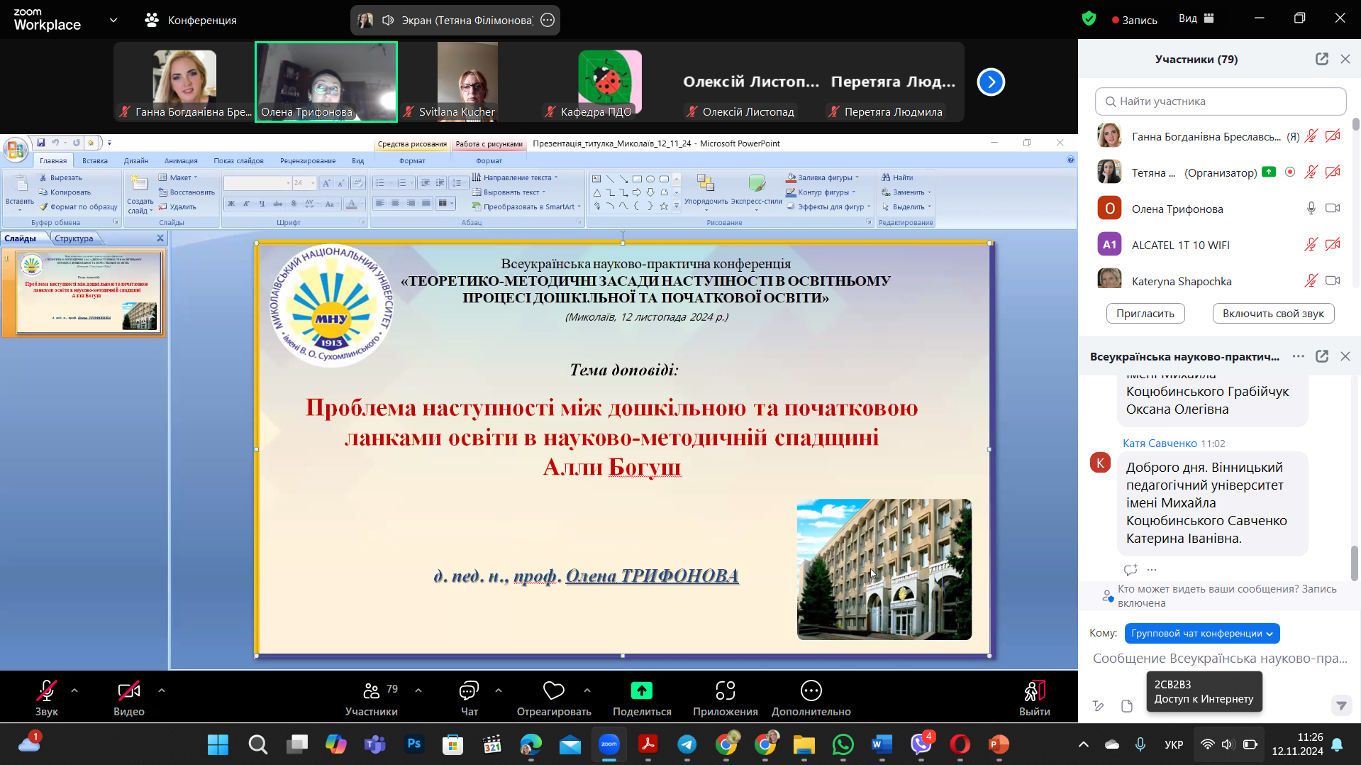 12 листопада 2024 р. кафедрою початкової та дошкільної освіти Миколаївського національного університету імені В. О. Сухомлинського проведено Всеукраїнську науково-практичну конференцію «Теоретико-методичні засади наступності в освітньому процесі дошкільної та початкової освіти».