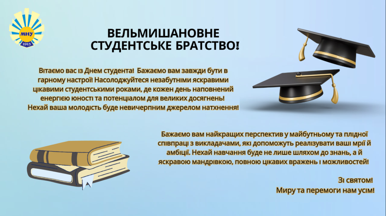 Привітання з Міжнародним днем студента! Якщо ви знайшли помилку, будь ласка, виділіть фрагмент тексту та натисніть Ctrl+Enter.