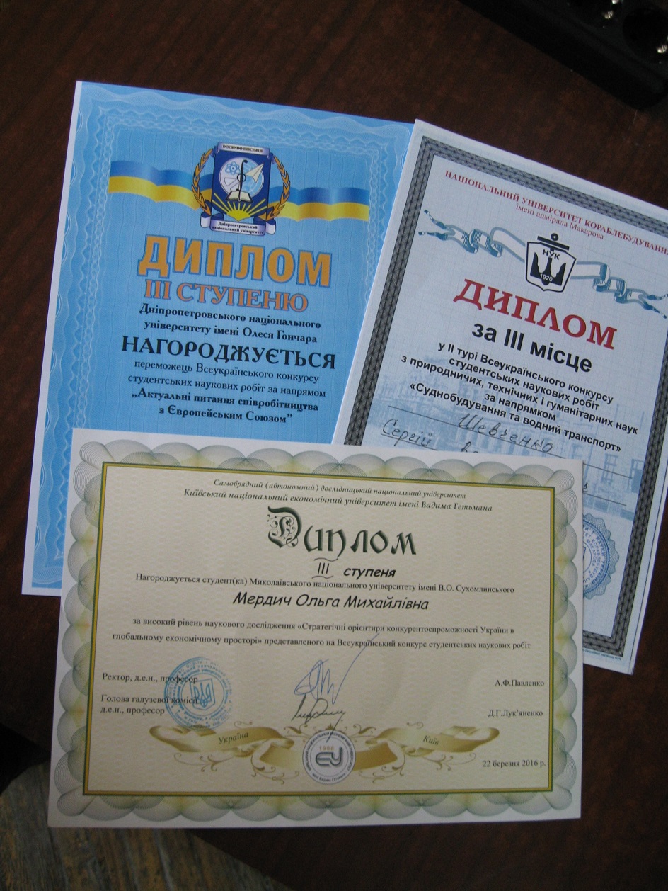 22 березня 2016 р. у Київському національному економічному університеті імені В. Гетьмана відбувся Всеукраїнський конкурс студентських наукових робіт у галузі «Світове господарство та міжнародні економічні відносини». Миколаївський національний університет імені В. О. Сухомлинського гідно представила магістрант економічного факультету Ольга Мердич. Наукова робота Ольги відзначена дипломом ІІІ ступеня.