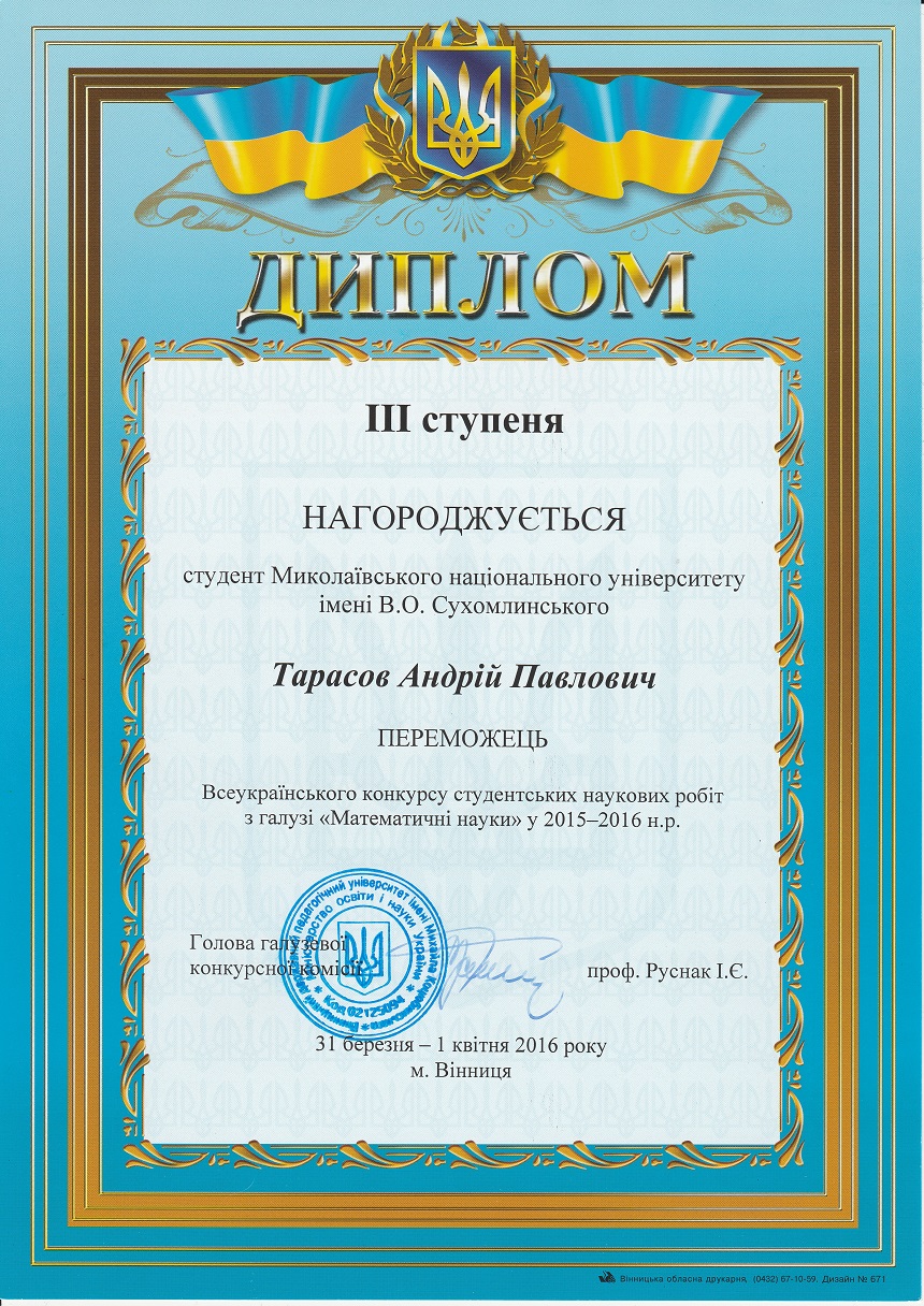 Вітаємо студента V курсу механіко-математичного факультету Тарасова Андрія Павловича з перемогою на Всеукраїнському конкурсі студентських наукових робіт із галузі «Математичні науки».