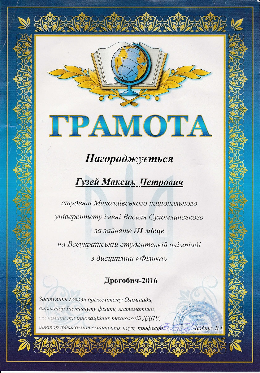 Вітаємо студента ІІІ курсу механіко-математичного факультету Гузея Максима з зайнятим ІІІ місцем на Веукраїнській студентській олімпіаді з дисципліни «Фізика».