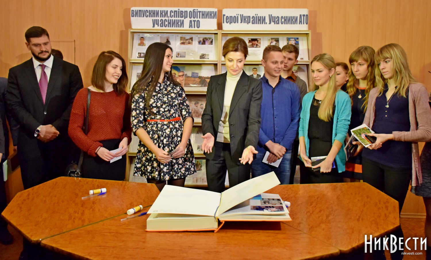 Марина Анатоліївна поспілкувалася з викладачами МНУ імені В. О. Сухомлинського, бійцями АТО та разом із дітьми-сиротами, чиї батьки загинули в АТО, заповнила Книгу Миру. «Книга стала своєрідною молитвою молоді за свободу та незалежність нашої держави. Це вже сьомий регіон, що закарбувався на її сторінках фотокартками сімей, чиї батьки стоять на захисті України, та побажаннями миру від студентів. Сподіваюсь, що ця книга побуває в різних кінцях світу і буде молитвою за мир в усьому світі».